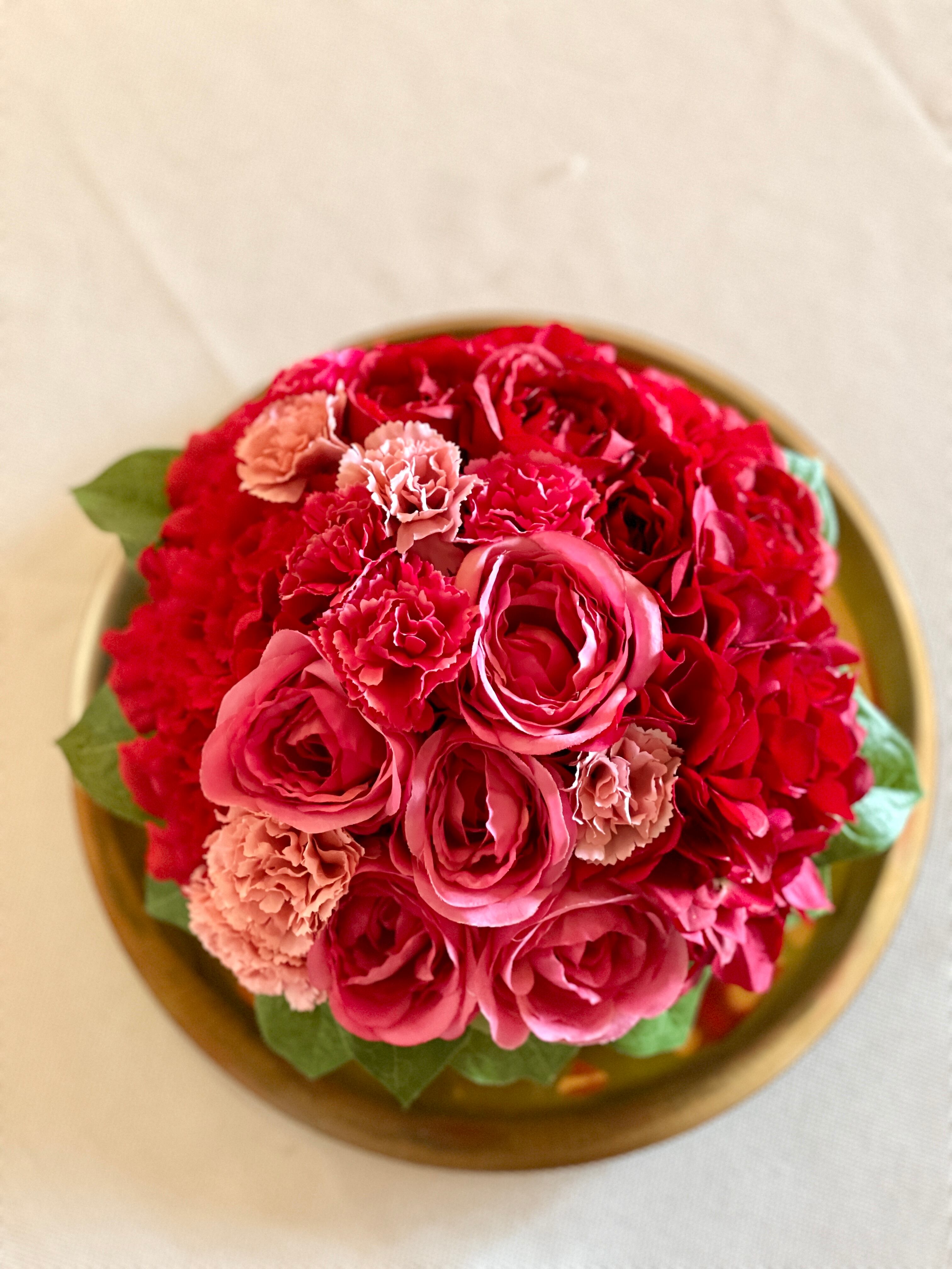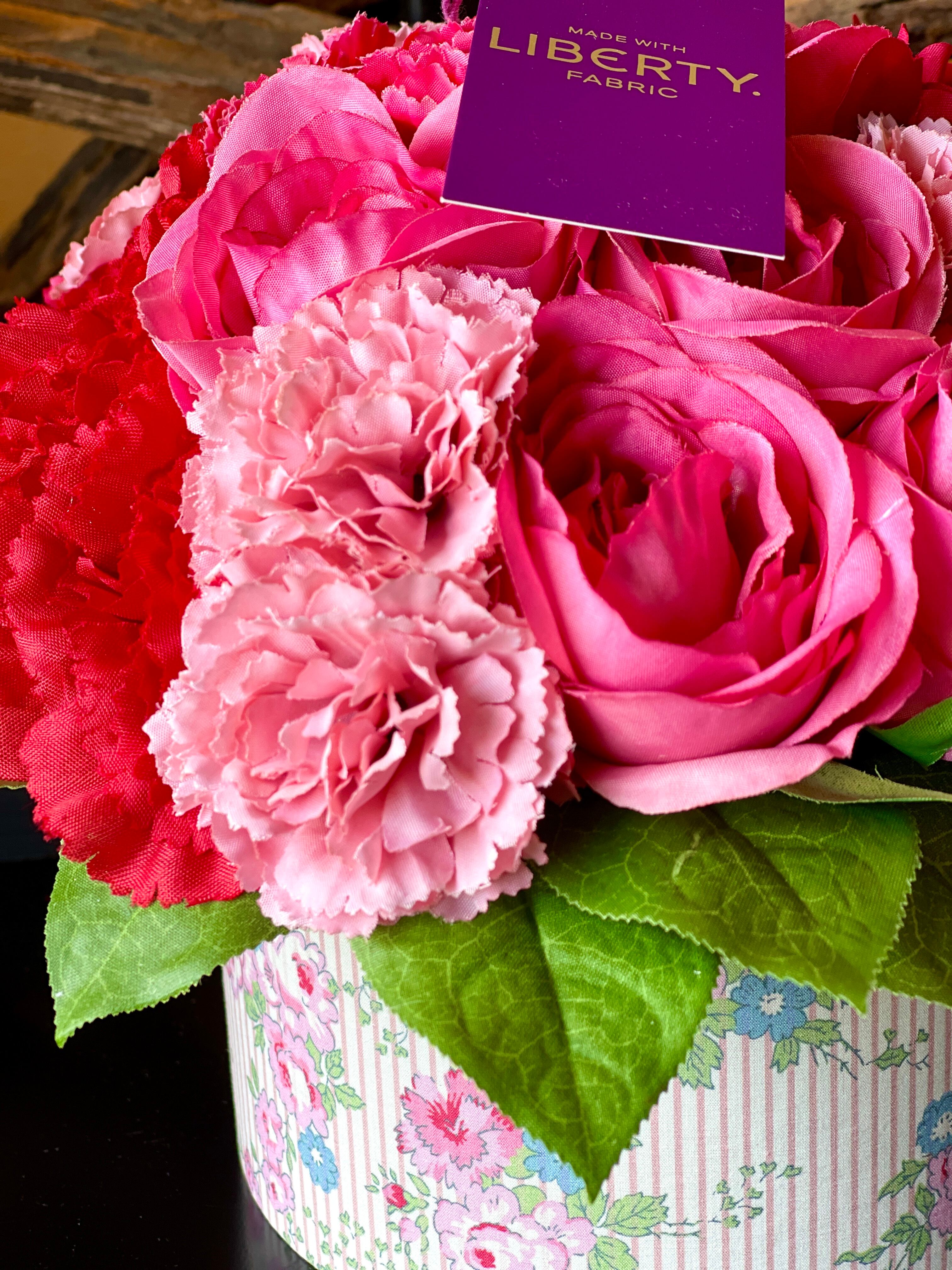 カーネーション、薔薇、紫陽花を活けたアレンジメント