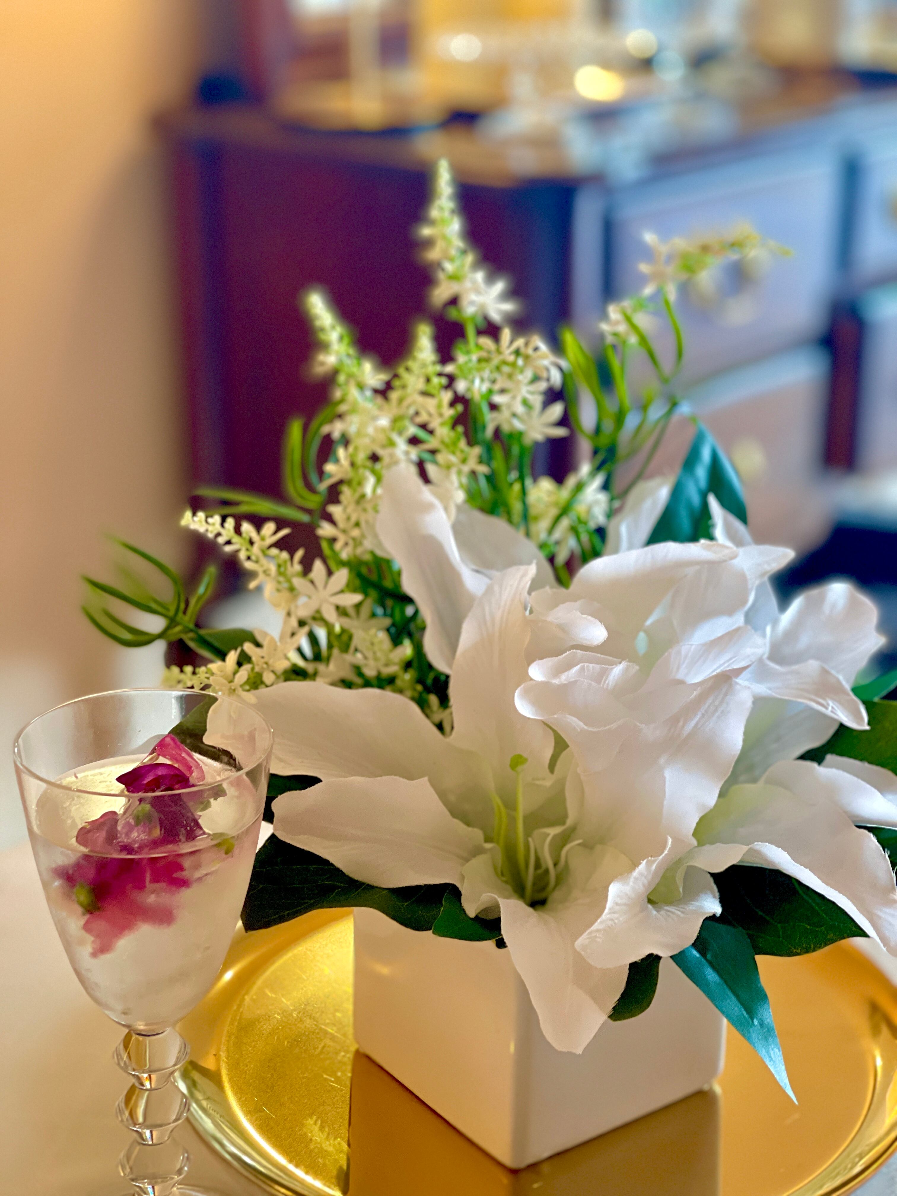 カサブランカとスレンダーベロニカを白陶器に活けた